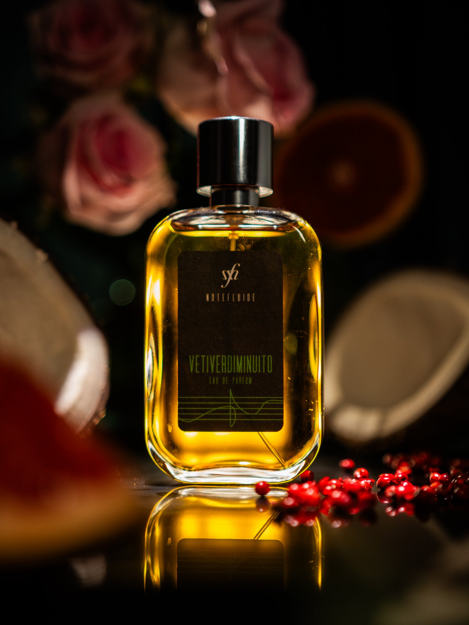 vetiver, pompelmo, pepe rosa, benzoino, cocco, rosa damascena, patchouly, incenso
